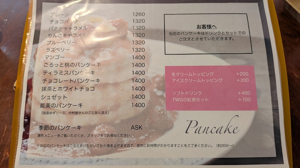 Seen through a reviewer’s lens, the menu at Satoyama Café feels thoughtfully curated, balancing comfort, creativity, and café-style indulgence without losing focus. Savory rice dishes anchor the lineup, from the rich, umami-forward 明太子オムライス to the familiar nostalgia of ケチャップオムライス, while variations like レモンサラダオムライス, レモンオムライス, and 和風 オムライス add brightness and Japanese flair. For those seeking something heartier, 天津飯 delivers satisfying depth, and アンチョビとニンニクのパスタ brings a bold, aromatic contrast to the rice-based options. The café’s dessert side is equally compelling, with pancakes taking center stage: the fruity freshness of ブルーベリーのパンケーキ, the sweet balance of りんごとキャラメルのパンケーキ, the locally inspired 能美パンケーキ, the indulgent チョコ バナナパン ケーキ, and the seasonal appeal of 限定モンブランパンケーキ all highlight variety and visual appeal. Classic sweets like ガトーショコラ round out the experience with a reliable, rich finish. Drinks are well-matched to both meals and desserts, ranging from simple ドリンク selections to comforting staples such as ブレンドコーヒー, ホットコーヒー, and the smooth, creamy カフェラテ. Overall, the menu feels cohesive and satisfying, offering enough range to please both casual diners and café enthusiasts while maintaining a clear identity rooted in comforting Japanese café cuisine.
